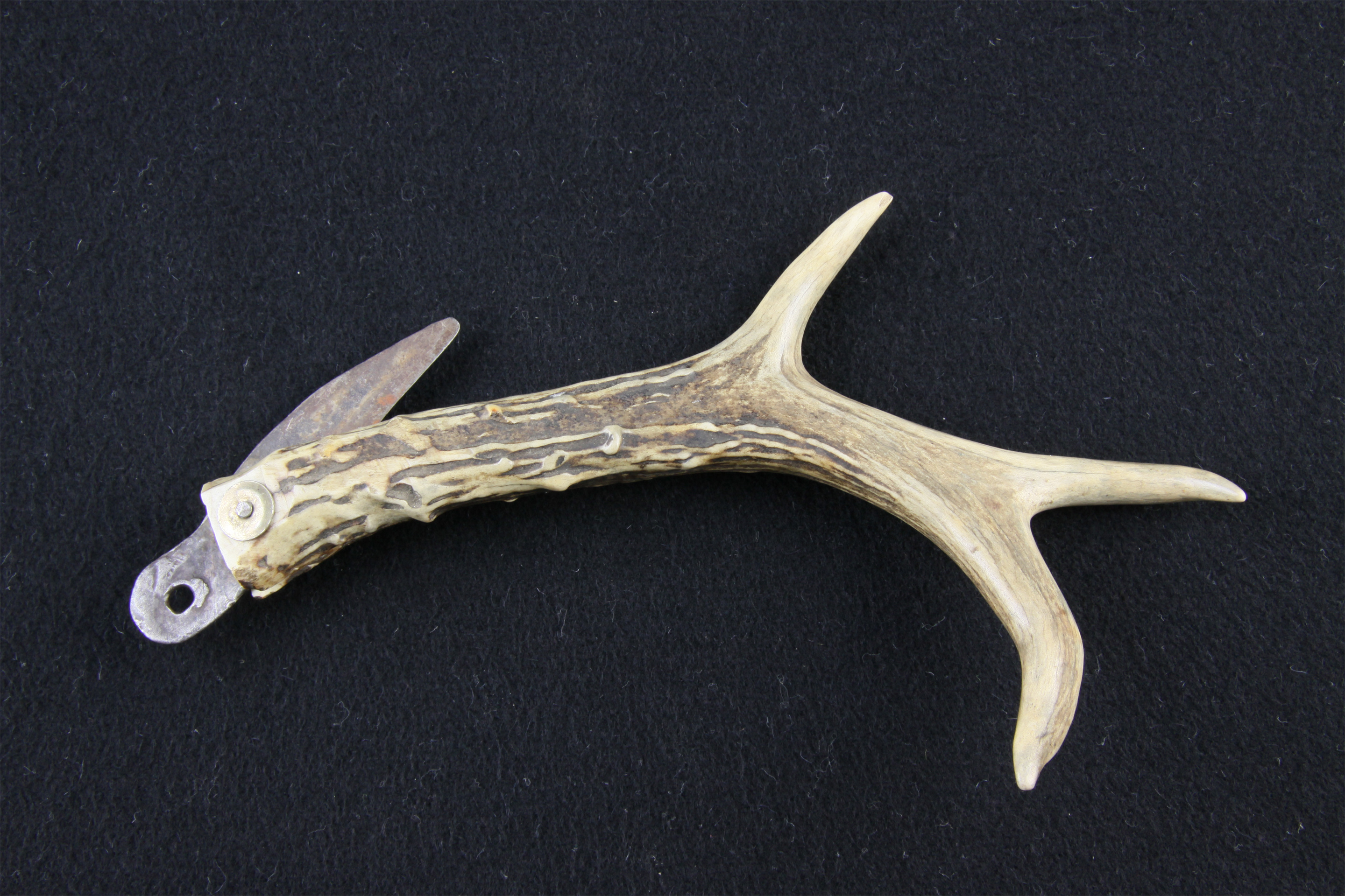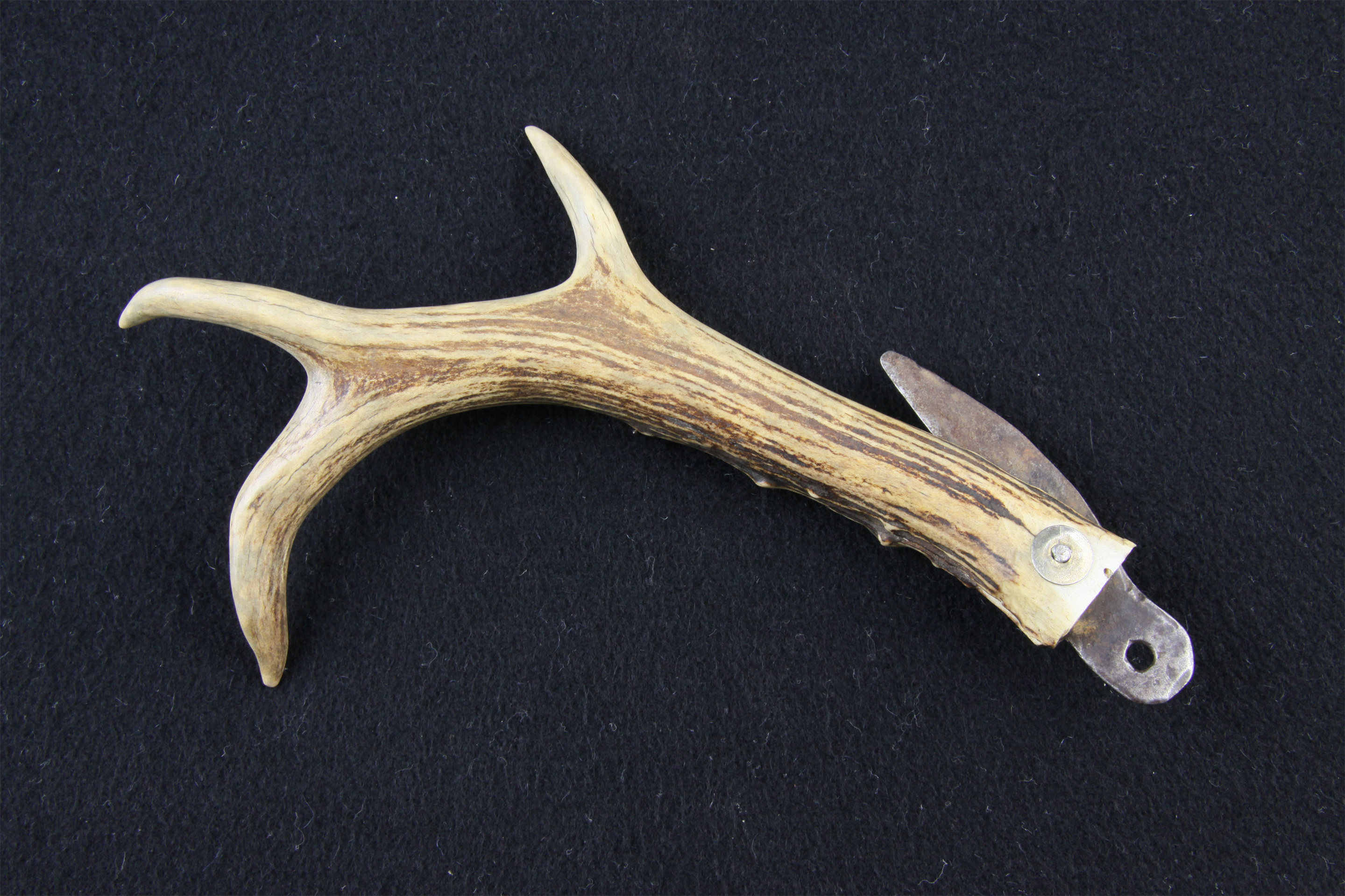 民国时期吉林乌拉街萨满祭祀所用鹿角柄刀: 手柄为梅花鹿角,已骨化的老角,整体为浅黄白色,质硬有光泽,呈分枝状,分三岔,主枝稍向后弯曲,分枝向两旁伸张,枝端渐细。根部具疣状突起,习称“骨钉”,并有纵棱,断面为白色。铁质刀片以铁铆和铜片固定于手柄上,刀身展开后与刀柄呈120度角,刀头部有孔,便于悬挂。
